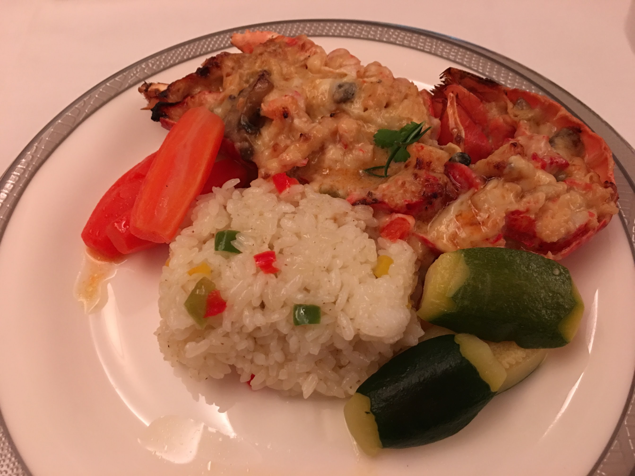 I had prebooked my meal – the lobster thermidor and it didn’t look good when brought out. From what I’ve heard since then, you only want to get the lobster if you’re departing Singapore. Anywhere else, it’s a miss. I prebooked my wife for the “Japanese meal” and it was A LOT of food. She enjoyed that more than I enjoyed my lobster.